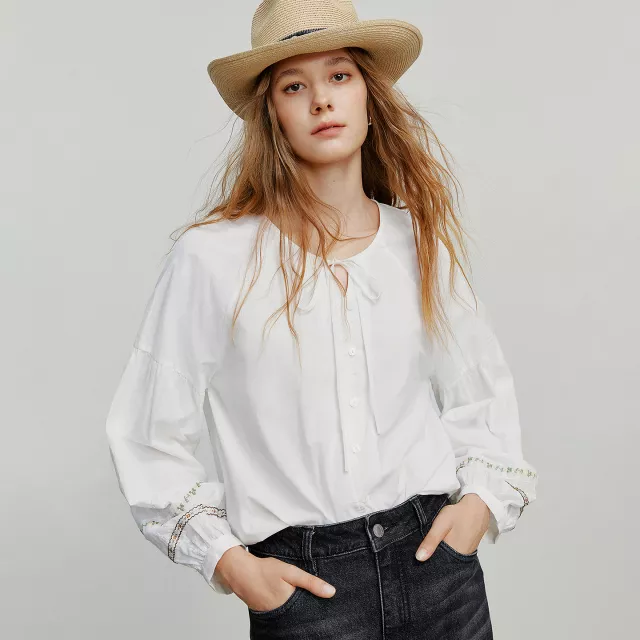 This blouse stands out because it blends classic refinement with subtle artistic detail. The lantern sleeves deliver a gentle retro feel, while the asymmetric cut adds modern personality. Crafted from high-quality natural fiber with a smooth finish, it offers durability, comfort, and an elevated look suitable for many occasions.