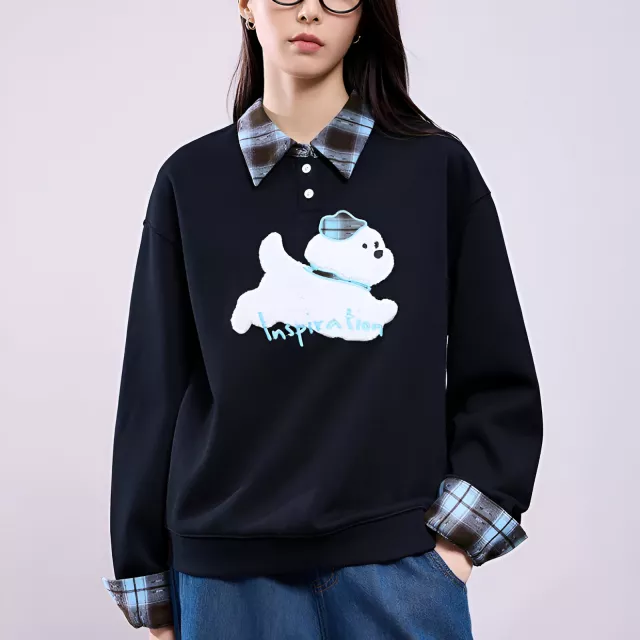 This sweatshirt stands out because it combines professional simplicity with a fun, creative twist. The faux two-piece appearance gives you the layered look of a shirt and knit top without extra weight or effort. The asymmetrical plaid panel adds modern contrast, while the embroidered dog design makes it feel personal and cheerful instead of plain. It’s a great balance between office-friendly style and weekend casual comfort.