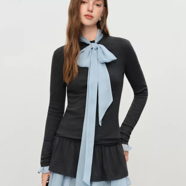 Chiffon Ribbon Ruffled T-shirt with Layered Two-piece Suit for Women