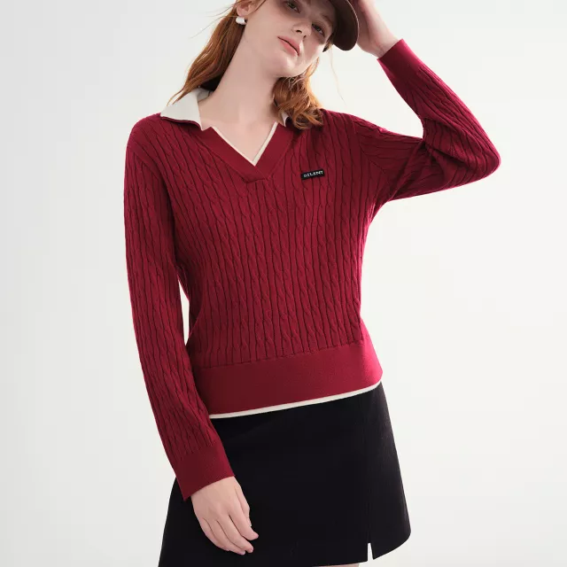 This sweater stands out thanks to its contrast color details paired with a soft cable knit pattern. The V-neckline creates a slimming, feminine look that works beautifully with both casual and dressed-up outfits. Made from a premium blend of polyester, acrylic, nylon, and sheep wool, it offers warmth without the heavy weight of traditional wool sweaters. The fabric feels soft on the skin and helps retain shape, so it stays looking fresh wear after wear.