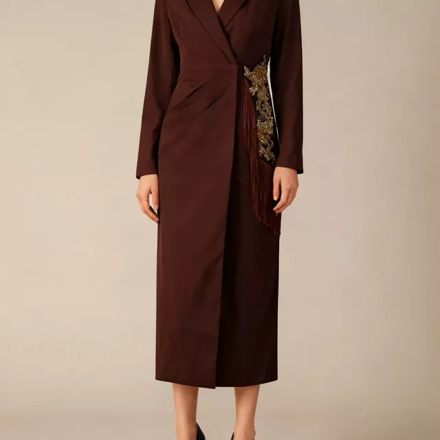 What makes this dress truly special is its elegant design and attention to detail. The notched collar and full-length sleeves bring a sophisticated vibe, while the empire waistline elongates your figure, creating a flattering, feminine shape. The tassel embroidery adds an artistic touch, setting this dress apart from ordinary styles. Whether you’re attending a gathering or an office event, this dress strikes the perfect balance between polished and fashionable.