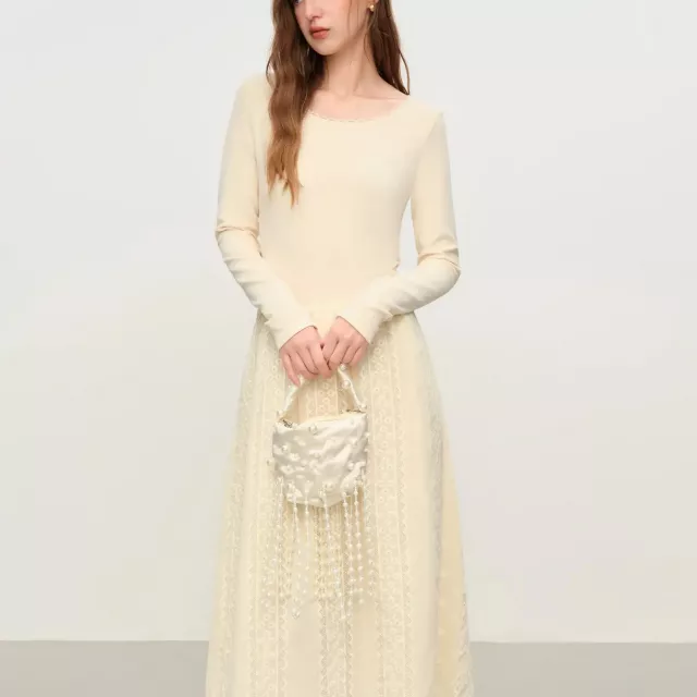 This dress stands out for its subtle elegance and thoughtful design. The embroidered lace detailing brings a soft, vintage feel, while the long sleeves make it perfect for cooler days. The structured yet comfortable knit fabric keeps its shape without feeling heavy, giving you a clean, graceful look every time you wear it. Its mid-calf length offers modest coverage while still feeling stylish and modern.