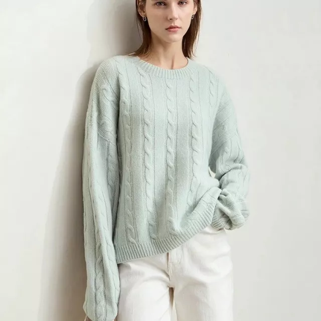 This sweater stands out with its full sheep wool fabric, offering natural warmth and breathable comfort. Unlike heavy, bulky winter knits, its medium-weight construction keeps you cozy without overheating. The twisted texture adds a subtle touch of design while staying true to its minimalist style, making it easy to pair with trousers, skirts, or jeans.