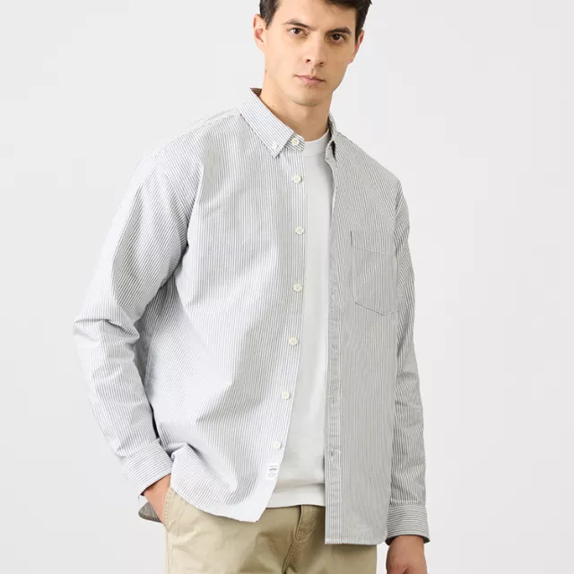 This shirt is crafted with full-length sleeves and a turn-down collar that maintains a clean, sharp appearance. The single-breasted closure adds simplicity, making it easy to pair with jeans, chinos, or casual trousers. The vertical stripes deliver a flattering, elongating effect that enhances your overall silhouette. Built with a tatting-weave Oxford fabric at 210gsm, it offers a comfortable amount of thickness ideal for autumn and winter.