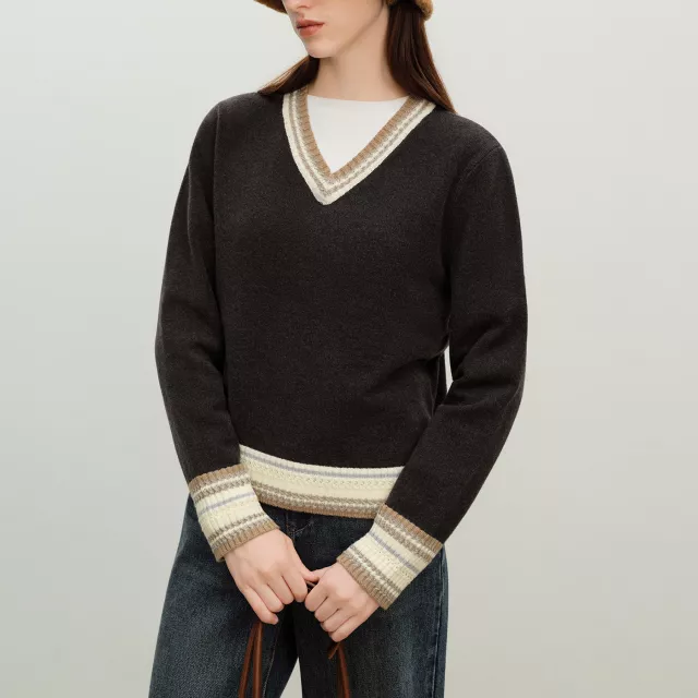 Petite V-Neck Color Block Knit Sweater – Relaxed Winter Office Top