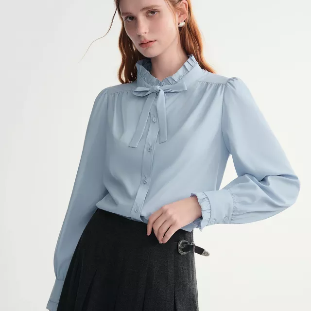 • Design: Features a ruffled collar, puff sleeves, and a chic lace-up tie front, perfect for a polished yet feminine look.