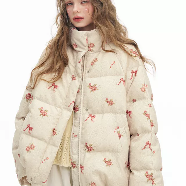 Vintage Rose Bow Puffer Jacket with Stand Collar for Women