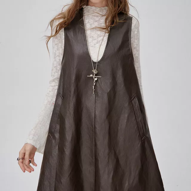 Step into the season with confidence in this casual loose brown PU leather vest dress, designed to make winter dressing both stylish and comfortable. Its relaxed silhouette and soft blended fabric offer a cozy feel without sacrificing your look. With a chic turn-down collar and subtle plaid pattern, this mid-calf dress adds a touch of sweetness to your everyday cold-weather outfits.