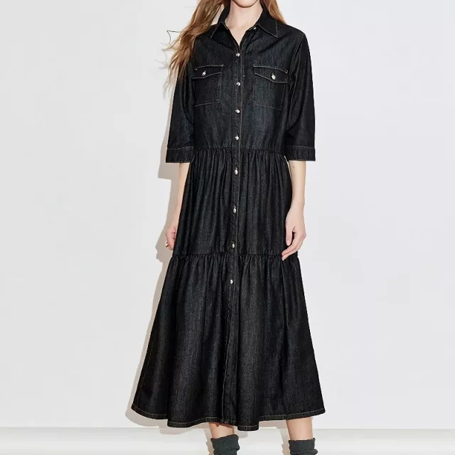 This Women’s Black Denim Patchwork A-Line Midi Dress stands out for its stylish, versatile design. The combination of high-quality cotton blend fabric and intricate patchwork detailing brings an air of retro charm to modern fashion. The mid-calf length and three-quarter sleeves give you the perfect amount of coverage without compromising on style. Whether you’re heading to the office or meeting friends for coffee, this dress is a go-to choice for an effortlessly chic look.