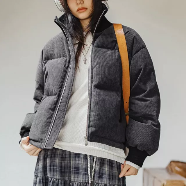 This women’s corduroy down puffer jacket is made for cold days when you want warmth without the bulk. With a soft corduroy texture and a clean, modern silhouette, it blends comfort with effortless street style. The short length gives you freedom to move, while the thick down filling locks in heat and keeps you cozy throughout winter.