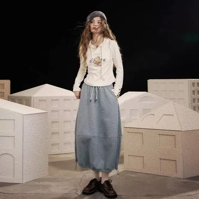 This slim-fit trumpet skirt follows your natural waistline and gently flares at the hem for a flattering mermaid shape. The elastic waistband with an adjustable drawstring hugs your waist comfortably without feeling tight. Made from a soft terry fabric blend of cotton and polyester, it offers just the right amount of warmth and a slight stretch for easy movement.